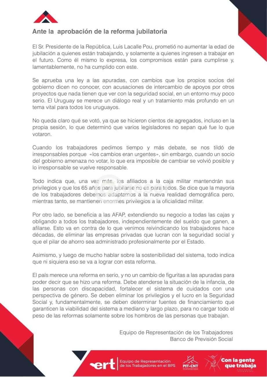 En un comunicado el Equipo de Representación de los Trabajadores en el directorio del BPS  expresó sus discrepancias  con la aprobación  de la reforma de la Seguridad Social, ya que  “luego de mucho hablar sobre la sostenibilidad del sistema, todo indica que ni siquiera eso se va a lograr con esta reforma”.
