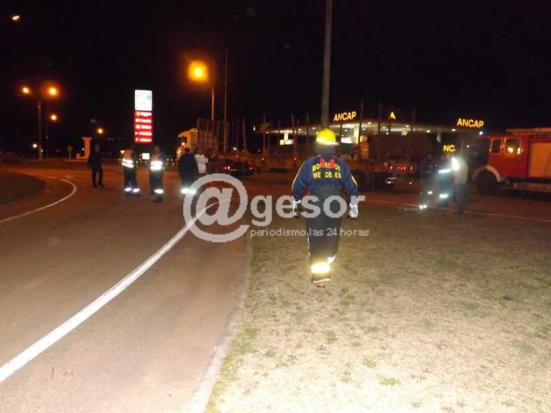 Sumado a esto y cuando el chofer del camión, ayudado por otro transportista, trataba de desenganchar la linga que había atrapado a su vehículo, justo en ese momento otro camión que transitaba por ruta 2 enganchó el otro extremo de la linga, provocando la caída de cables de Antel y de Cable Visión, y de una columna de madera que se encontraba colocada en el extremo oeste, llevando a que el poste de unos 6 metros de altura recorriera el trayecto de aproximadamente 65 metros, dando de lleno contra la cabina del camión que era donde se encontraban el conductor y el otro camionero que ayudaba a destrabar la situación.