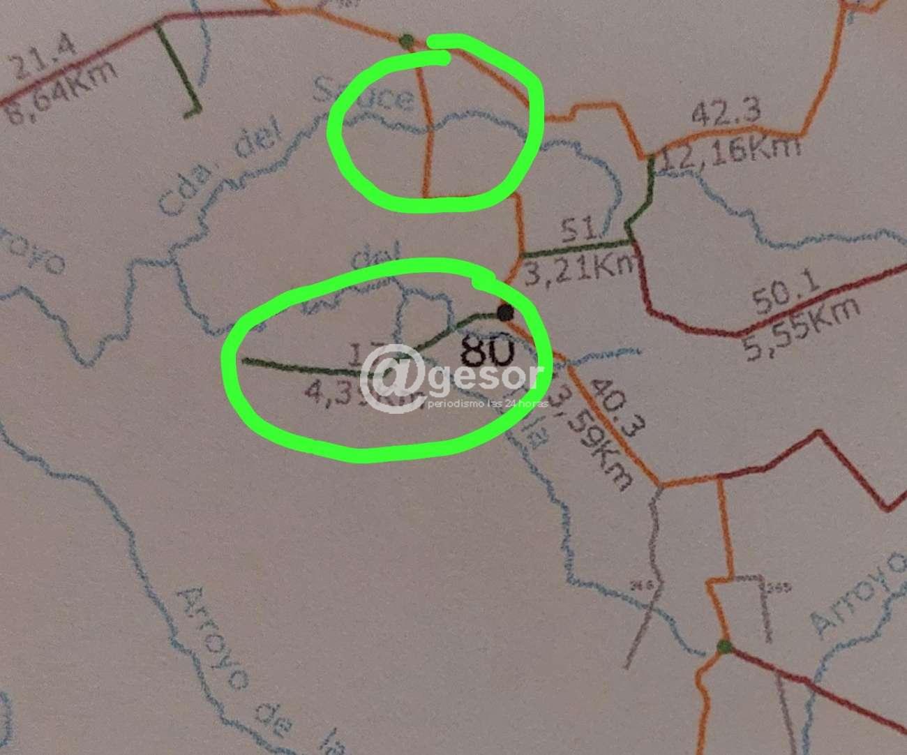 Se trata del paso que está sobre la cañada del Sauce en el camino identificado en el mapa de caminos municipales con el número 40.3 y que nos manifiestan que para evitar el mismo los productores están recorriendo casi 10 kms para tomar un camino alternativo y de los 2 pasos que se encuentran sobre el arroyo de El Tala en el camino identificado con el número 17.