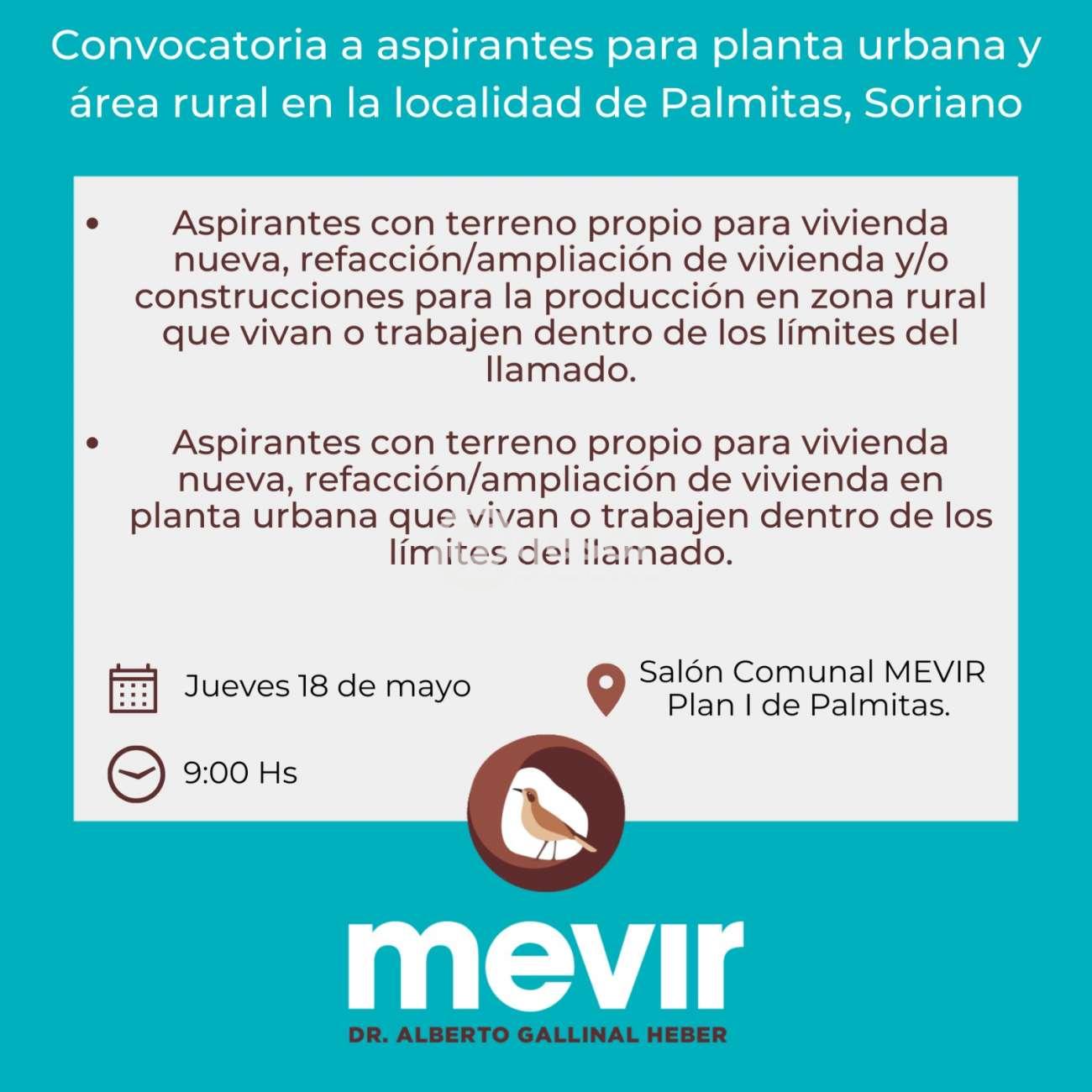 MEVIR convoca a aspirantes a viviendas en Palmitas