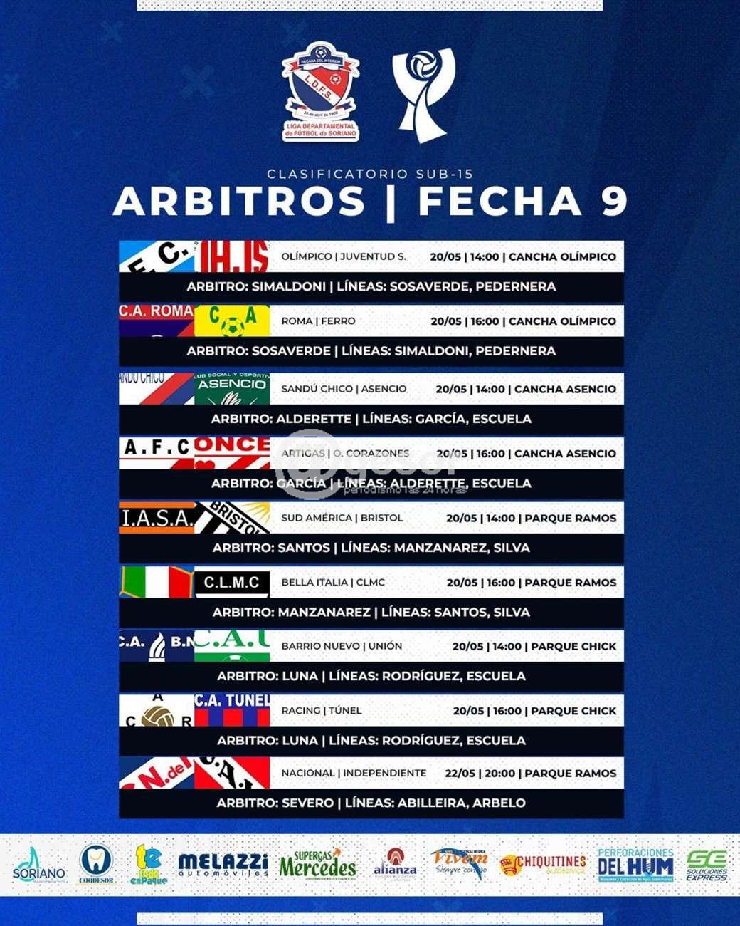 También se fijaron las ternas arbitrales para la 9ª fecha del Campeonato Clasificatorio de la categoría Sub 15 que se juega íntegramente este sábado 20, a excepción del encuentro entre Nacional e Independiente que se disputará este lunes 22 a las 20.00 en el parque "Carlos Ramos".