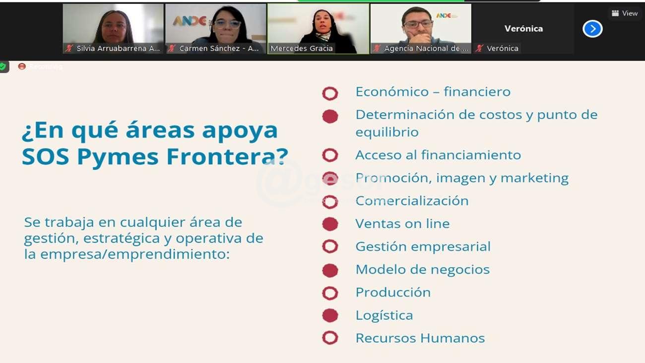 En la oportunidad, la presidenta de ANDE Carmen Sánchez explicó que se "adaptó el SOS Pymes tradicional para complementar las medidas anunciadas por el gobierno, y que con este instrumento se busca aportar a la competitividad de las pequeñas empresas en zonas en donde hay mayor necesidad". Durante el lanzamiento, que se realizó en formato virtual, los gerentes de Acceso al Financiamiento Mercedes Gracia, y de Desarrollo Empresarial Sebastián Ruiz, dieron detalles de la convocatoria, que ya está abierta. El objetivo es sostener e impulsar el nivel de actividad y empleo de las micro y pequeñas empresas (mypes) de los departamentos de Artigas, Salto, Paysandú, Río Negro y Soriano, como respuesta al contexto económico desfavorable que enfrentan en la actualidad.