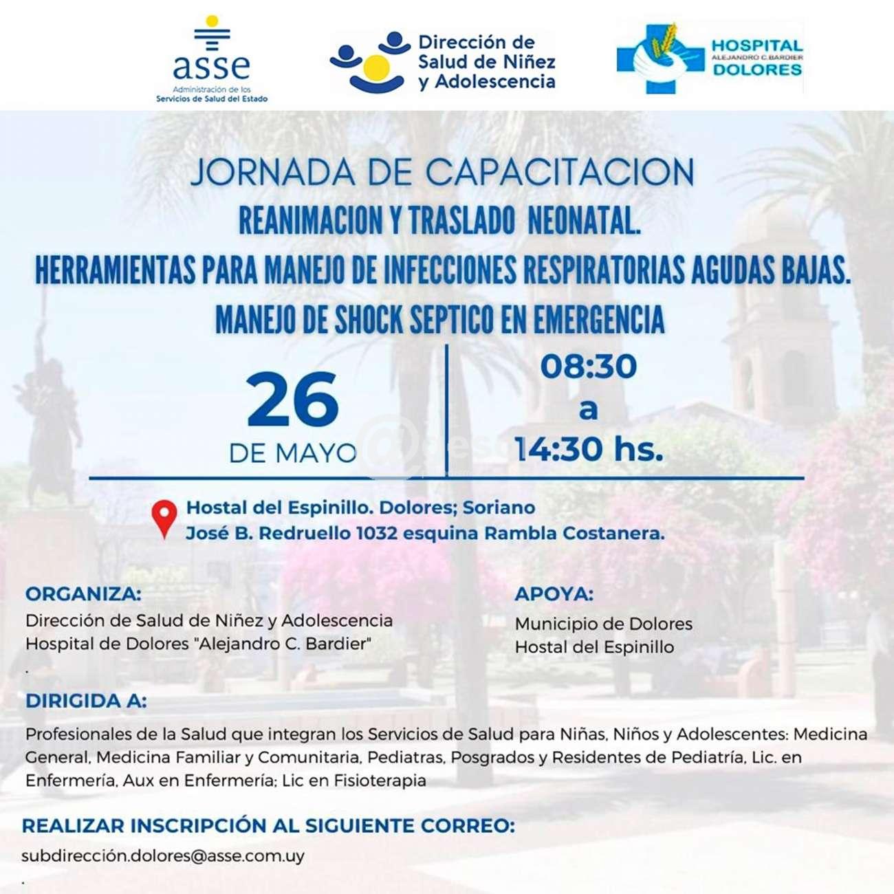 Con la organización de la Dirección de Salud de Niñez y Adolescencia y el Hospital de Dolores "Alejandro C. Bardier", con el apoyo del Municipio de Dolores y Hostal del Espinillo, se realiza este viernes 26 de mayo jornada de capacitación sobre: Reanimación y traslado neonatal; Herramientas para manejo de infecciones respiratorias agudas bajas; manejo de shock séptico en emergencia.