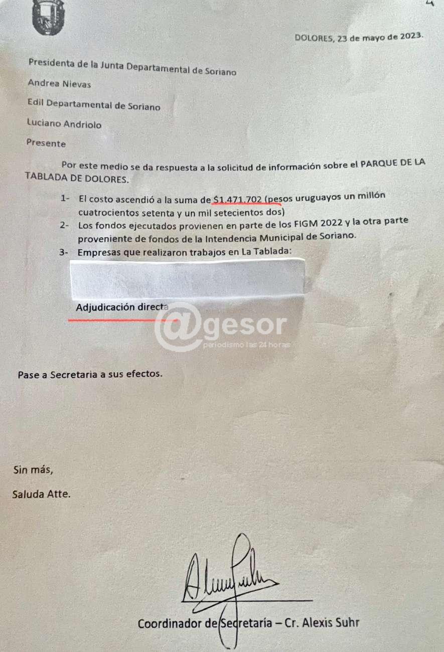 El Edil Luciano Andriolo informó: "$ 1.471.702 (pesos uruguayos un millón cuatrocientos setenta y un mil setecientos dos) fue lo que salió la última intervención en La Tablada de Dolores, la obra fue adjudicada a 3 empresas en forma directa, no hubo estudio de inundabilidad ya que lo hicieron en una zona inundable.