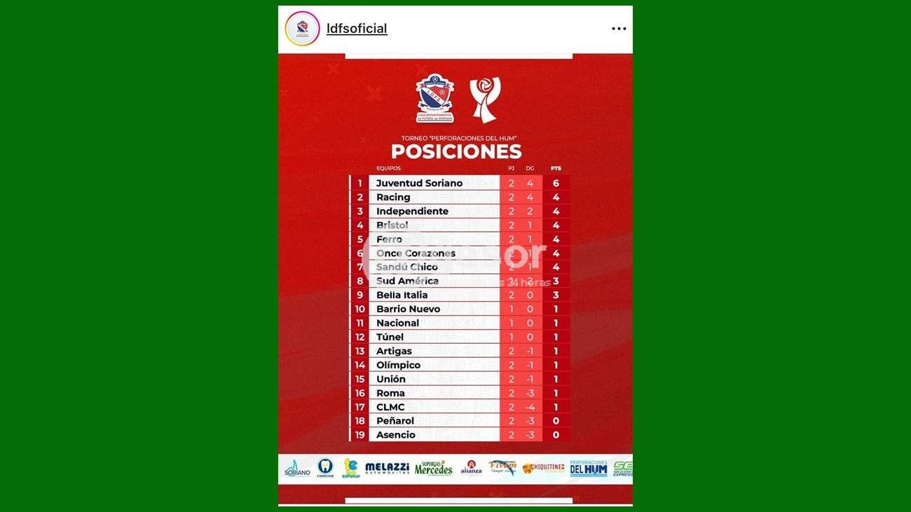 Tras disputarse la segunda fecha del Torneo “Perforaciones del Hum” del fútbol mercedario, la tabla de posiciones tiene a Juventud Soriano como líder, con 6 puntos, seguido de Racing, Independiente, Bristol, Ferro, Once Corazones, y Sandú Chico con 4 puntos. En tanto Sud América y Bella Italia tienen 3 puntos. Con un punto se ubican Barrio Nuevo, Nacional, Túnel, Artigas, Olímpico, Unión, Roma y CLMC. Cierran la taba Peñarol y Asencio con cero.