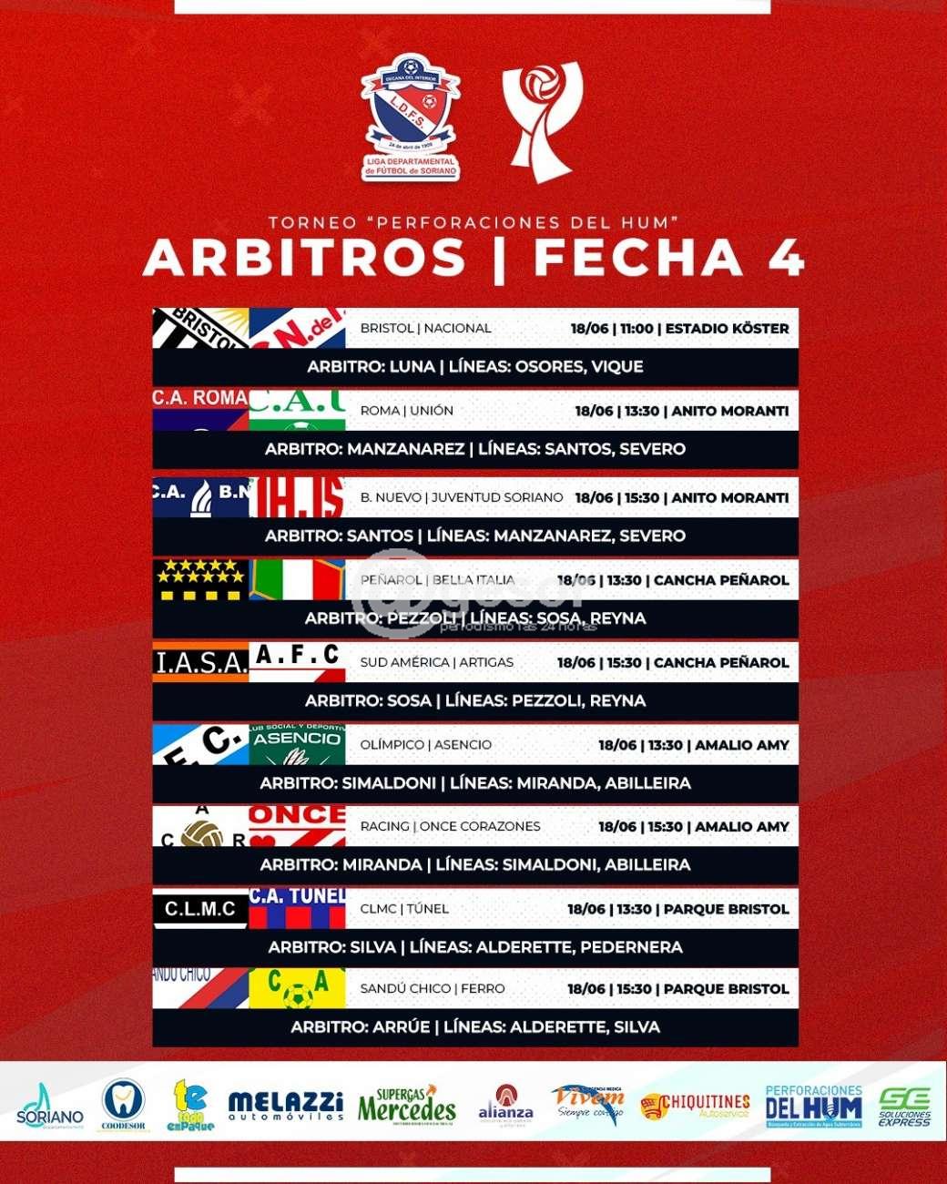 Desde la Liga Departamental de Fútbol de Soriano se dieron a conocer las ternas designadas por el Colegio de Arbitros que estarán encargadas de dirigir los encuentros de la 4ª fecha del Torneo "Perforaciones del Hum" de la primera división del fútbol mercedario.