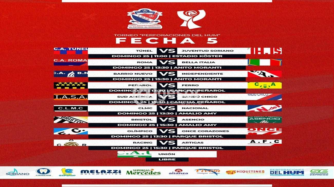 La quinta fecha del torneo “Perforaciones de Hum” del fútbol mercedario se disputará el domingo en cuatro canchas. Unión tendrá fecha libre. Los nueve partidos son los siguientes: