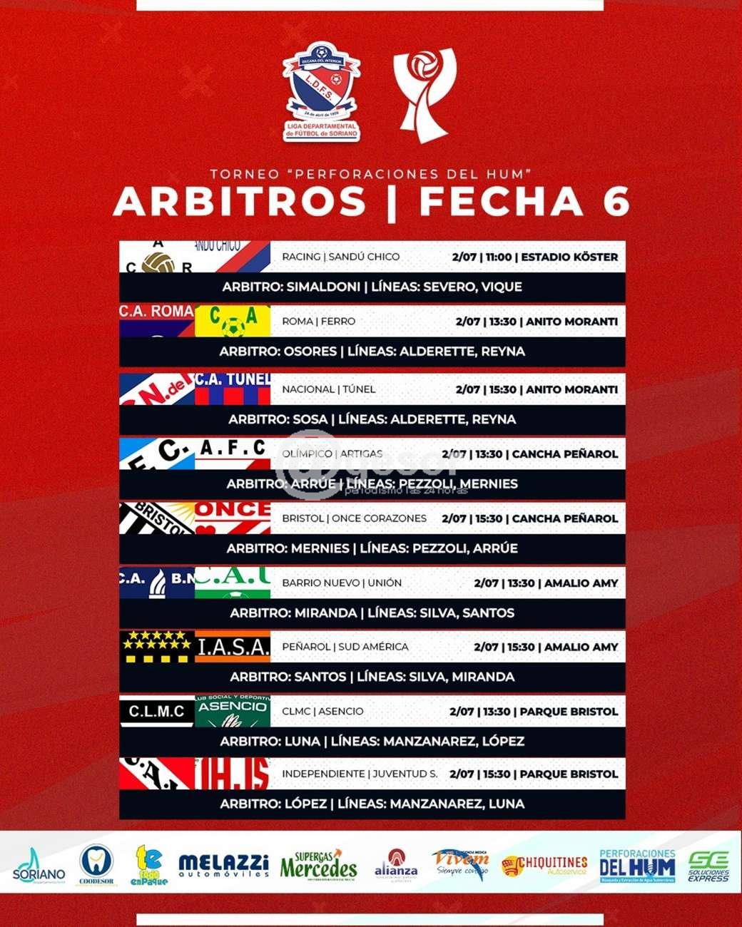 Así lo hizo conocer el Colegio de Arbitros de la Liga Departamental de Fútbol de Soriano con el juego entre Racing y Sandú Chico que comienza la fecha a las 11.00 en el estadio Köster para la televisión