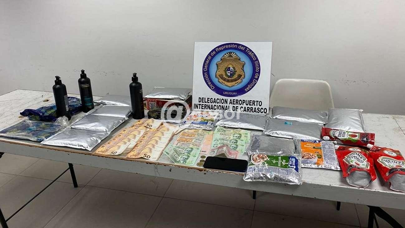 Ante esto los policías actuantes procedieron a identificarla. Al revisar su equipaje se detectaron paquetes de diferentes artículos que en su interior contenían sustancia blanca, como por ejemplo paquetes de ketchup y de atún, botellas de champú, chancletas con doble fondo en la suela, un bizcochuelo con un paquete en su interior y varios paquetes más ocultos en un doble fondo de la valija. Además de la droga se le incautaron 750 euros, 1.182 pesos uruguayos y un celular.