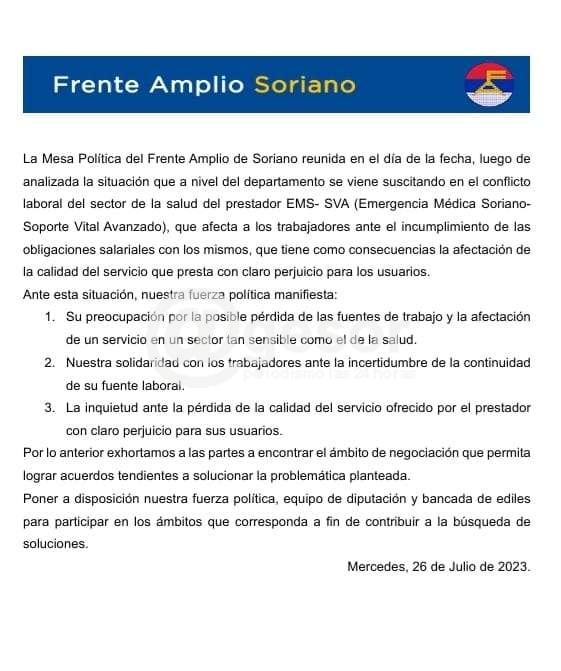 La Mesa Política del Frente Amplio de Soriano reunida en el día de la fecha, luego de analizada la situación que a nivel del departamento se viene suscitando en el conflicto laboral del sector de la salud del prestador EMS- SVA (Emergencia Médica Soriano-Soporte Vital Avanzado), que afecta a los trabajadores ante el incumplimiento de las obligaciones salariales con los mismos, que tiene como consecuencias la afectación de la calidad del servicio que presta con claro perjuicio para los usuarios.