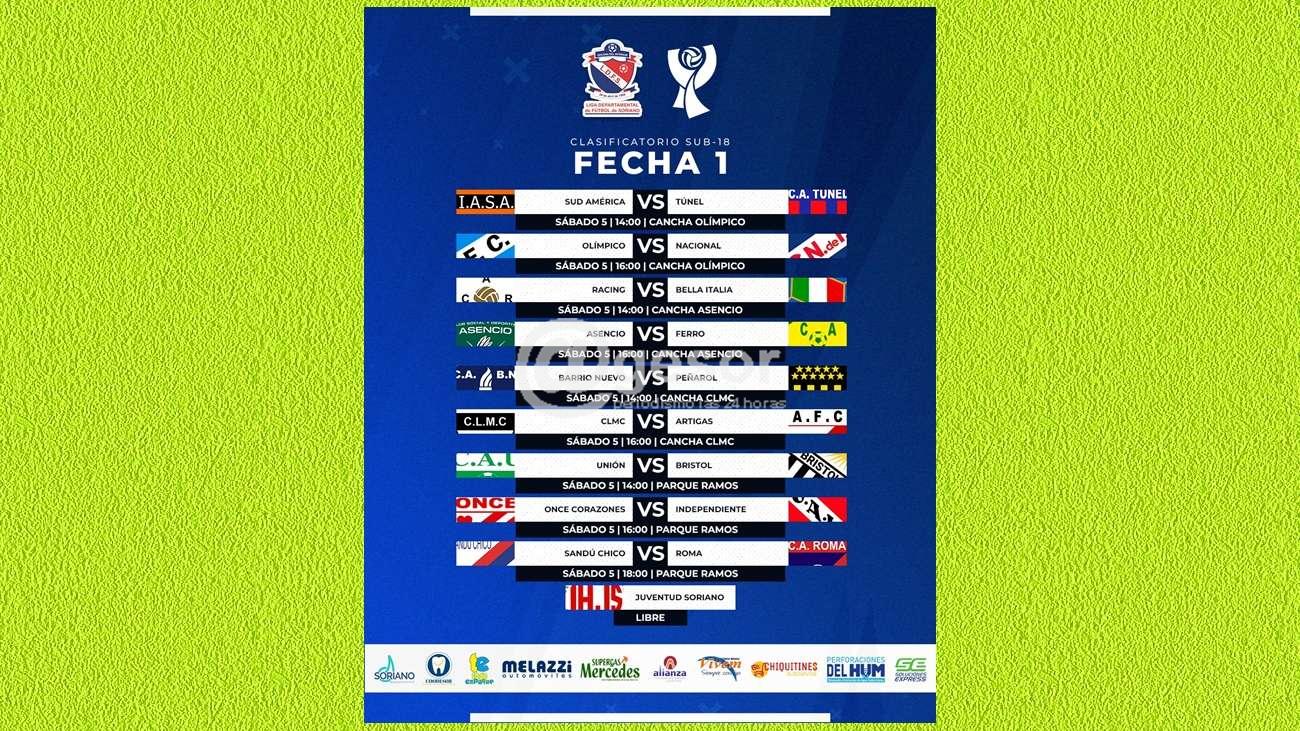 Nueve partidos conforman la primera fecha del campeonato de la Sub 18 del fútbol mercedario. Todos los partidos se disputarán el sábado en canchas de Olímpico, Asencio, CLMC y Parque Ramos..