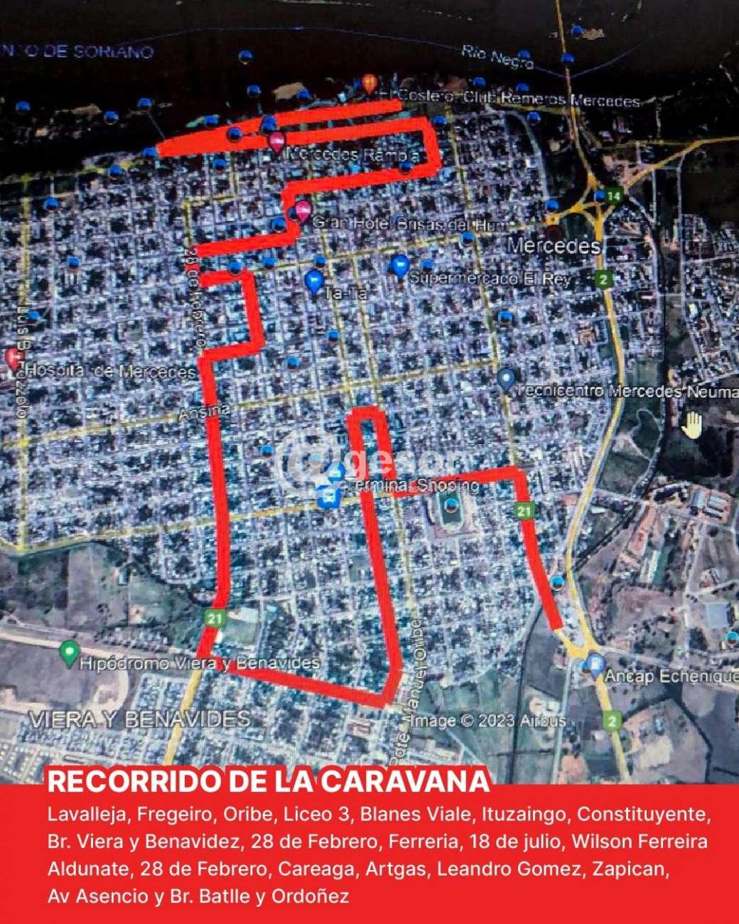 Estarán recorriendo calles de la capital sorianense en caravana, con concentración en accesos a la ciudad para luego hacer Lavalleja, Fregeiro, Oribe, Liceo 3, Blanes Viale, Ituzaingó, Constituyente, bulevar Viera y Benavidez, 28 de Febrero, Ferrería, 18 de Julio, Wilson Ferreira Aldunate, 28 de Febrero, Careaga, Artigas, Leandro Gómez, Zapicán, avda. Asencio y bulevar Batlle y Ordoñez.