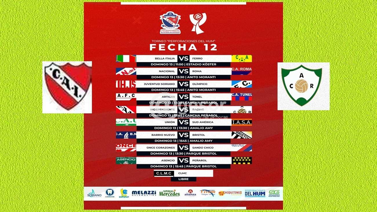 Comienza el domingo en el estadio Koster entre Bella Italia y Ferro a la hora 11 , a las 13 y 30 en el Moranti juegan Nacional vs Roma y a segunda hora Juventud Soriano vs Olímpico. En cancha de Peñarol a primera hora 13 y 30 juegan Artigas vs Túnel y a segunda hora el partido de la fecha entre Independiente y Racing que son escoltas del líder Bristol. En el Amy juega a primera hora Unión vs Iasa a primera hora y a las 15 y 45 Barrio Nuevo enfrenta a Bristol- En el parque del Bohemio juegan a primera hora Once Corazones vs Sandú y a segunda hora otra gran partido entre Asencio y Peñarol. Queda libre en esta fecha 12 el club CLMC.