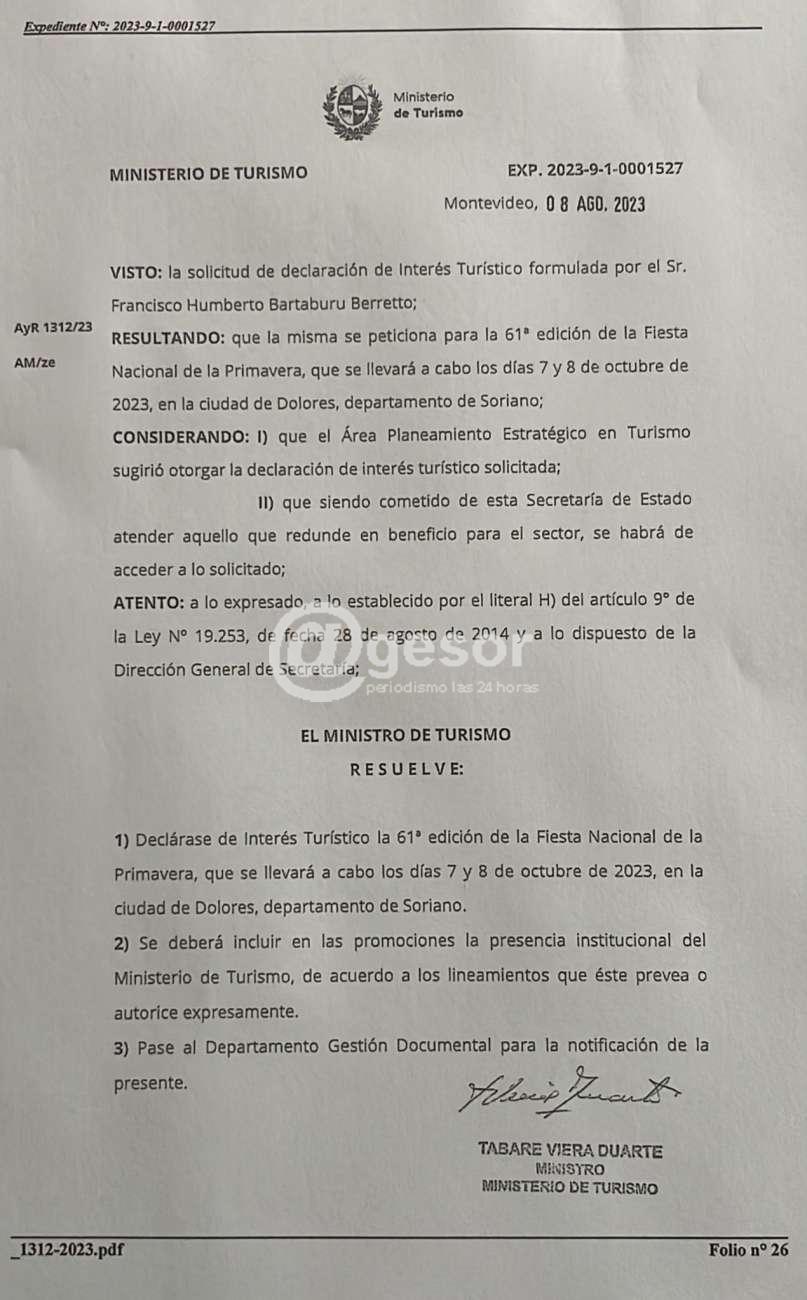 La 61ª edición de la Fiesta Nacional de la Primavera, de Dolores se realizará los días 7 y 8 de octubre próximo. Tras el estudio correspondiente el Ministro Tabaré Viera firmó esta declaratoria de interés turístico por lo que “se deberá incluir en las promociones la presencia institucional del Ministerio de Turismo, de acuerdo a los lineamientos que éste prevea o autorice expresamente”.