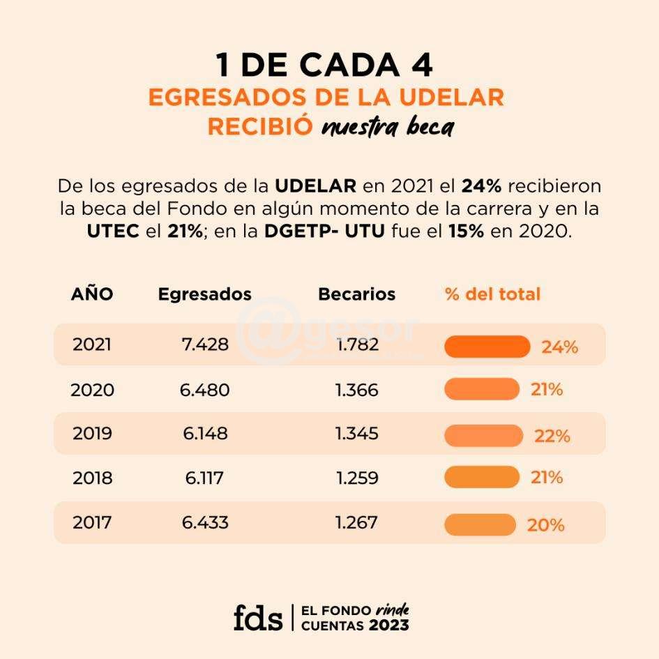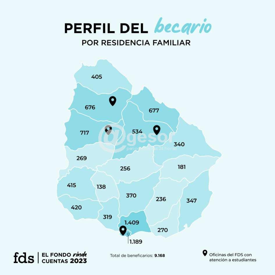 Este año, la institución otorga a 9.168 jóvenes partidas de apoyo económico de hasta $ 11 320, ascendiendo a $ 900 000 000 el monto destinado a las becas. Casi el 90 % de los beneficiarios son del interior, mientras que más del 10 % reside en Montevideo. Más del 90 % de los apoyos fueron a estudiantes de la Udelar. Para el 91 % de los beneficiarios, se trata de la primera generación de su familia en ingresar a la educación terciaria.