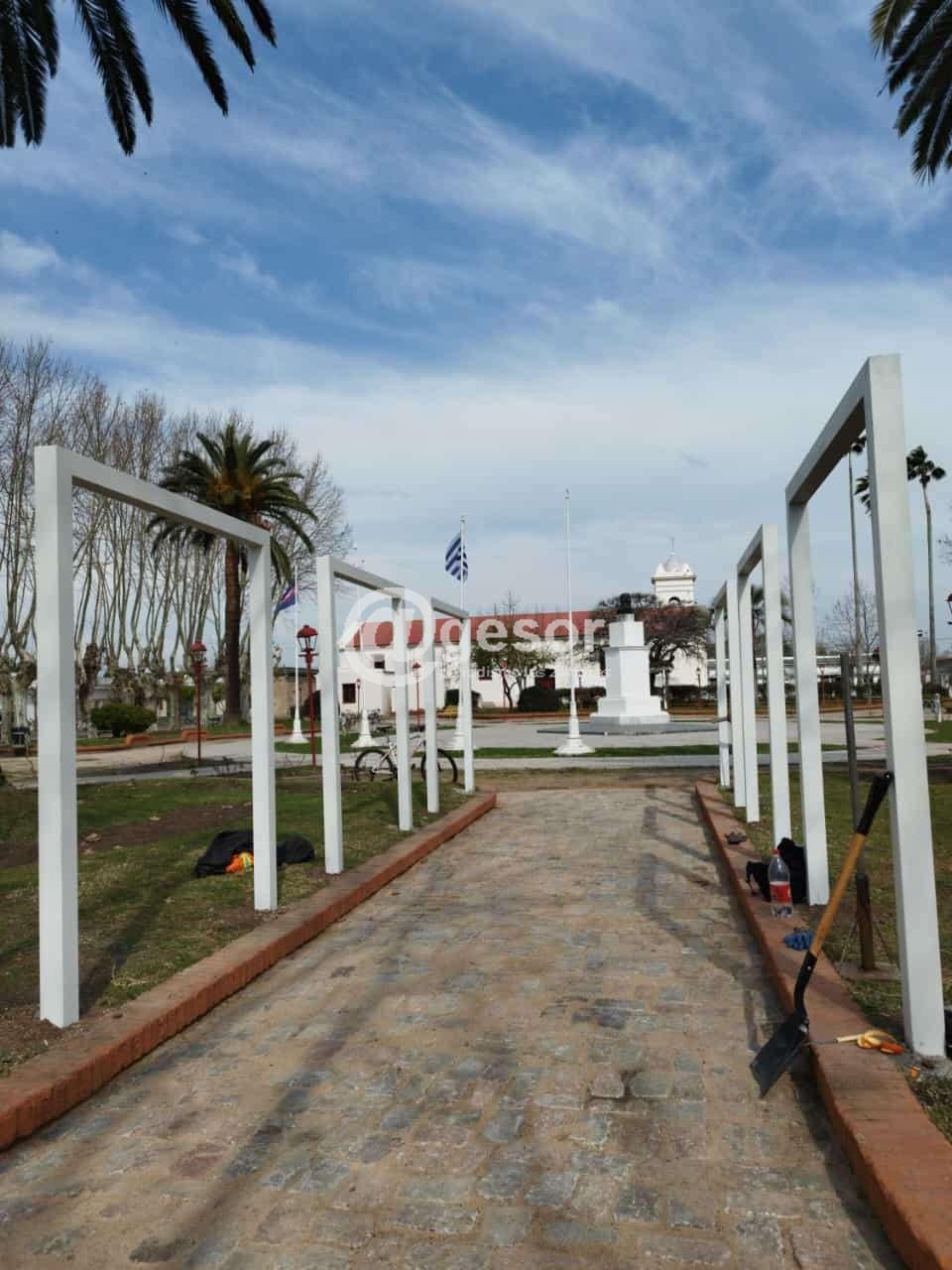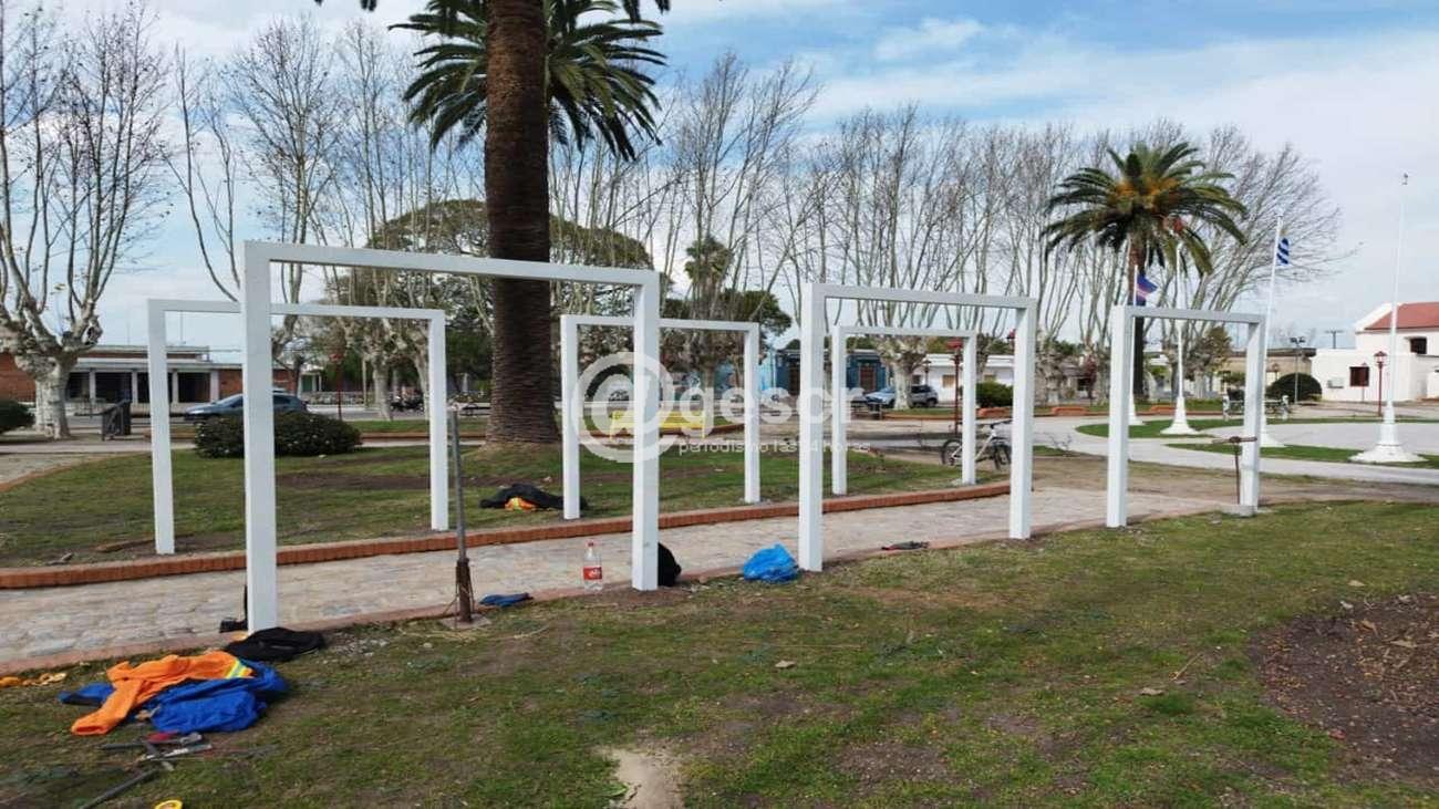 En la plaza “Artigas” se realizó el montaje de una segunda pérgola, donde en breve se procederá a la plantación de las rosas en sus canteros para completar la obra generando un pequeño rosedal.