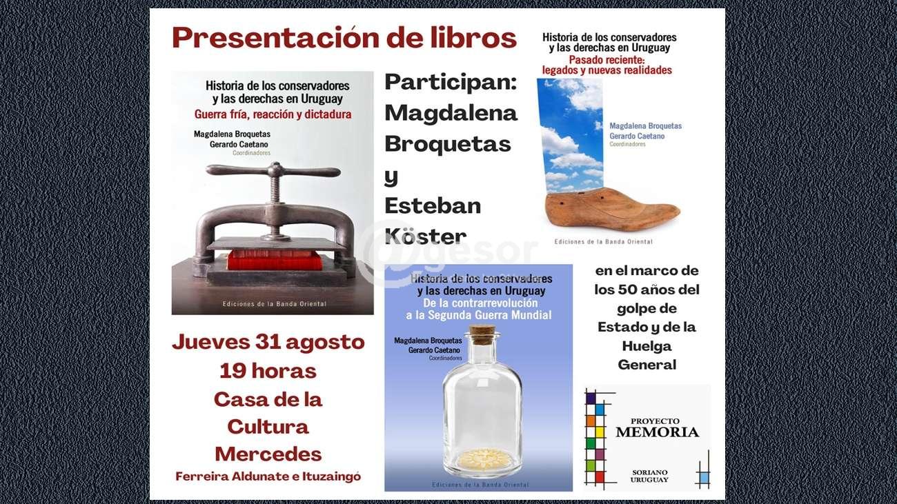 La Comisión Memoria, Justicia y contra la impunidad de Soriano organiza la presentación de tres libros, los tres tomos de Historia de los conservadores y las derechas en el Uruguay; de Magdalena Broquetas y Gerardo Caetano. En ellas se aborda la Guerra fría, reacción y dictadura, Pasado reciente: legados y nuevas realidades; y De la contrarrevolución a la Segunda Guerra Mundial.