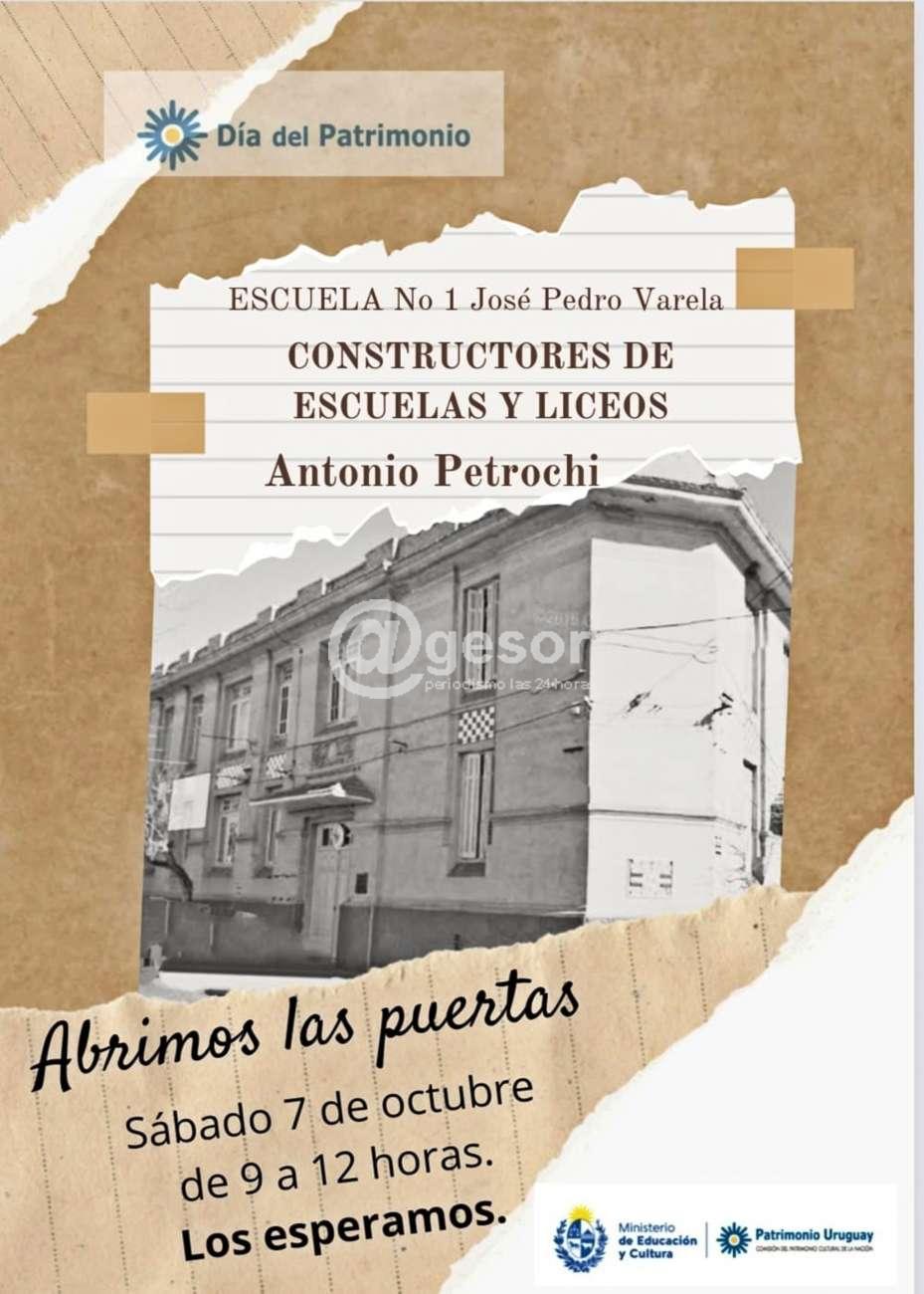 En el marco del Día del Patrimonio que se desarrolla durante sábado 7 y domingo 8 de octubre, en homenaje a Constructores de Escuelas y Liceos en este caso Antonio Petrochi, este sábado 7 de octubre de 9.00 a 12.00 horas la Escuela Nº 1 "José Pedro Varela" de Mercedes estará abierta para poder ser visitada por quienes deseen conocer el interior del centro escolar.