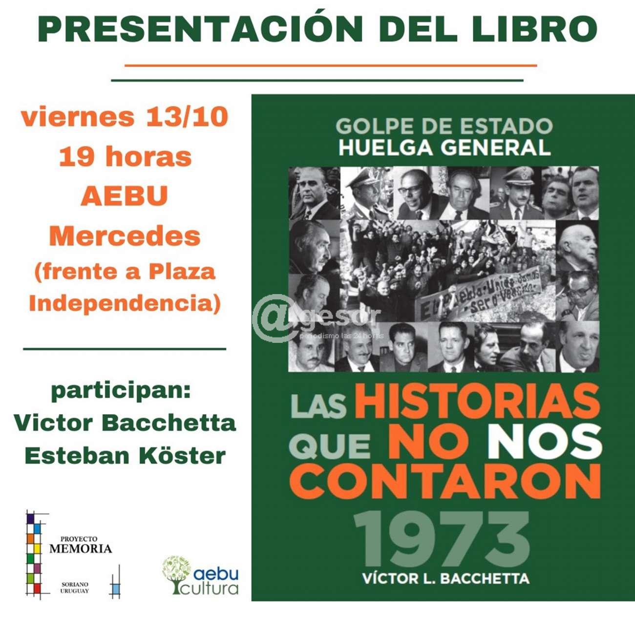 Este viernes 13 de octubre a las 19.00 horas en sede de AEBU ubicada en calle Giménez frente a plaza Independencia en Mercedes, junto con Esteban Köster, Víctor L. Bacchetta presenta el libro Golpe de Estado, Huelga General, ¨Las historias que no nos contaron 1973¨.