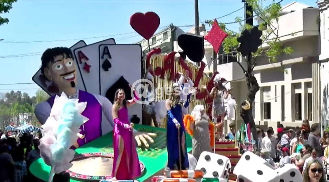 CARROZA N° 10 ¨Las Vegas¨ de los sextos unidos del Liceo N° 1 ¨Roberto Taruselli¨ proponen: "Ultmo día de clases, último timbre de recreo, termina un ciclo, una nueva ventana se abre. Nuevos desafíos nos esperan, experiencias, tiempo de volar, desconcierto, incertidumbre, melancolía, recuerdos de hermosos momentos compartidos, hoy comienza una nueva etapa y hay que festejar y qué mejor forma que realizando un viaje de egresados a Las Vegas".