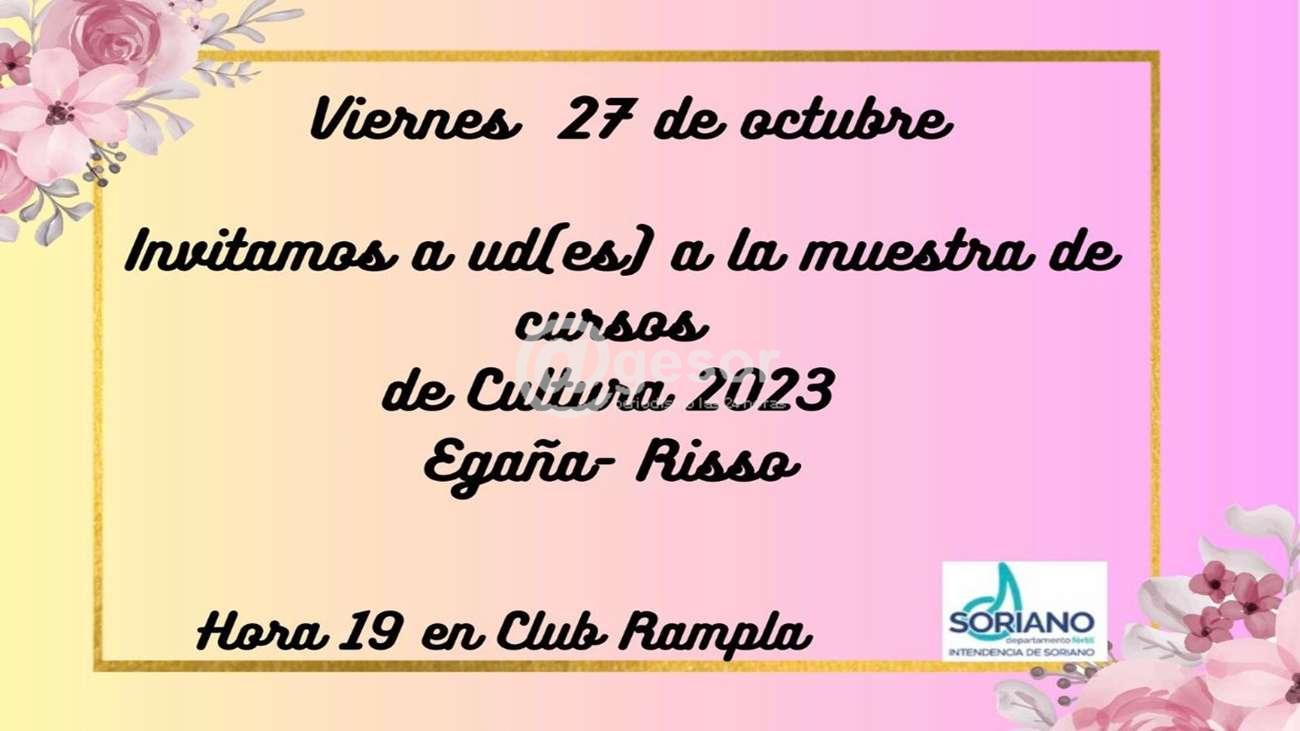 El viernes 27de octubre en el Club Rampla de Risso se realizará la muestra de cursod de Cultura de Egaña - Risso. Se trata de los trabajos realizados en los diferentes cursos durante ete año.