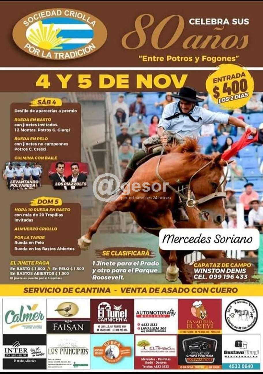 La Sociedad Criolla "Por la Tradición" en camino Elías Regules (ejido de Mercedes - Soriano) en el marco de la celebración de sus 80 años, está invitando a disfrutar del festival "Entre potros y fogones" a desarrollarse los días sábado 4 y domingo 5 de noviembre en predio de la institución.