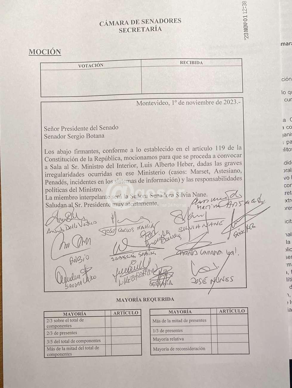 La iniciativa expresa: “Los  abajo firmantes, conforme a lo establecido en el artículo 119 de la Constitución de la República, mocionamos para que se proceda a convocar a Sala al Sr. Ministro del Interior, Luis Alberto Heber, dada las graves  irregularidades ocurridas en ese Ministerio (casos:  Marset, Astesiano,  Penadés, incidentes en los sistemas de información) y las irresponsabilidades políticas del Ministro.