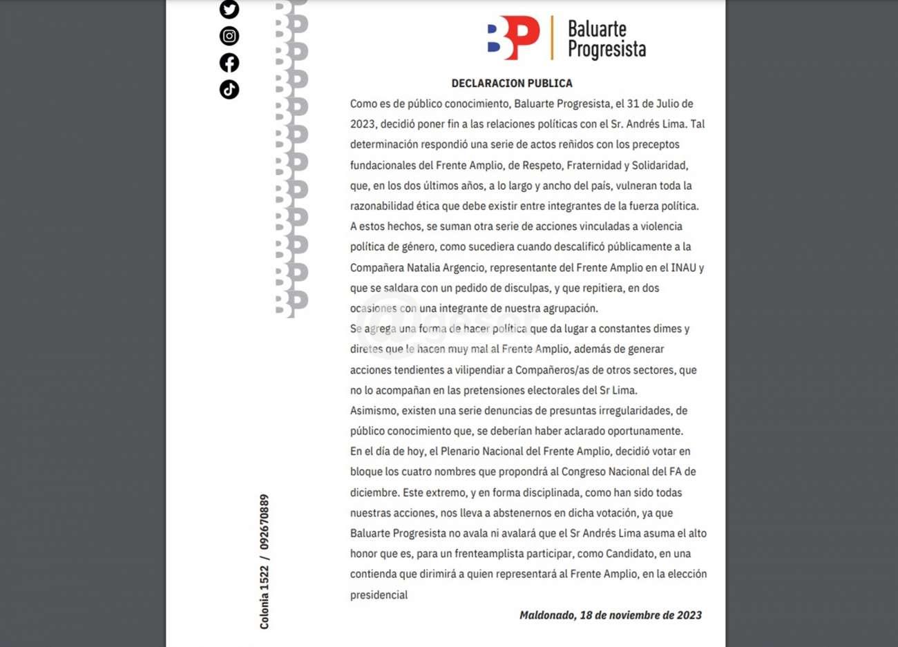 El sector frenteamplista Baluarte Progresista emitió declaración en la que rechaza la precandidatura de Andrés Lima tras la decisión del Plenario Nacional del FA votara en bloque los cuatro nombres que propondrá al Congreso Nacional del FA en diciembre, entre ellos el de Lima.