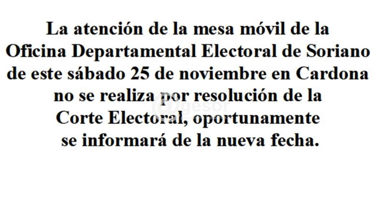 La atención de la mesa móvil de la Oficina Departamental Electoral de Soriano de este sábado 25 de noviembre en Cardona no se realiza por resolución de la Corte Electoral, oportunamente se informará de la nueva fecha.