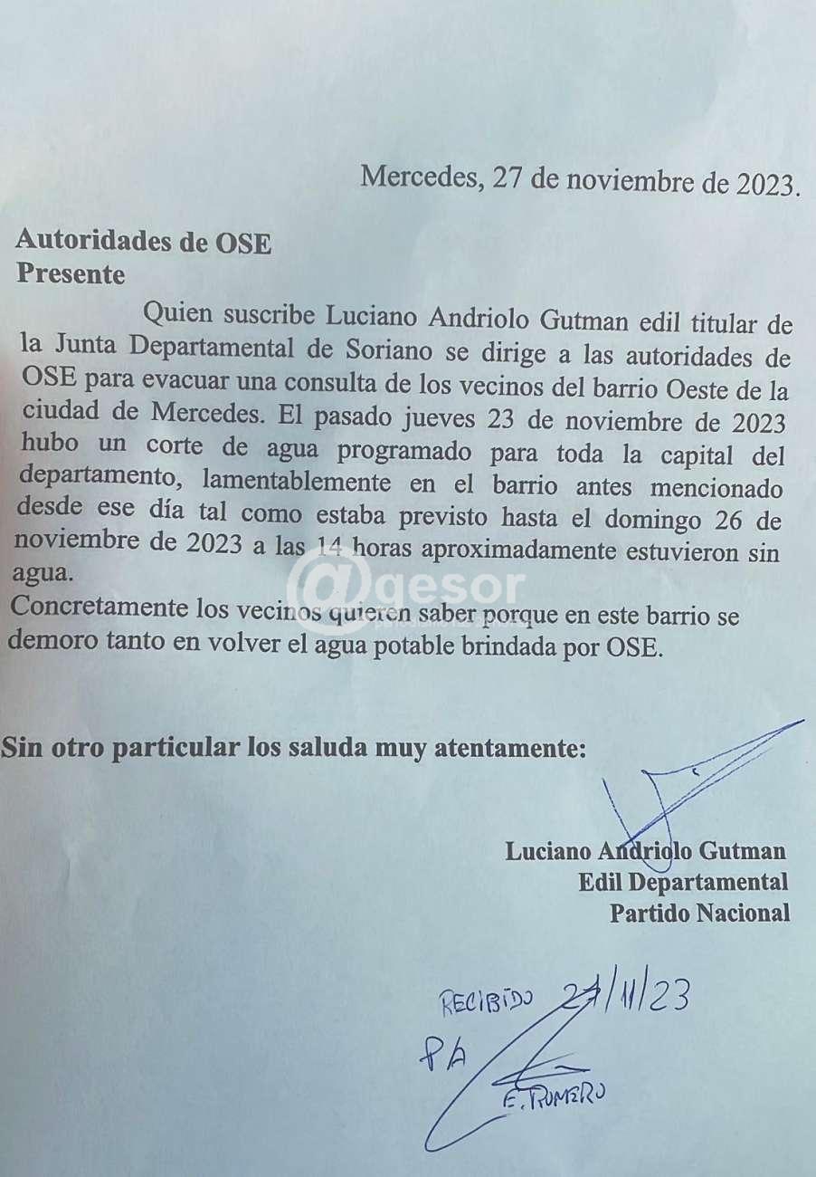 El Edil Luciano Andriolo informó: "Presentamos un pedido de informes a OSE para saber las razones de la demora para que se restableciera el suministro de agua potable en el barrio oeste de Mercedes. El corte estaba previsto de la noche del jueves 23 a la mañana de viernes 24 y en este barrio recién se normalizó el domingo 26 a la hora 14.00 aproximadamente. Esperaremos la respuesta y estamos manejando la posibilidad de presentar un recurso para solicitar al directorio de OSE una consideración en la facturación de la gente del barrio oeste. Como sucedió en el departamento de Durazno cuando quedó 72 horas sin suministro".