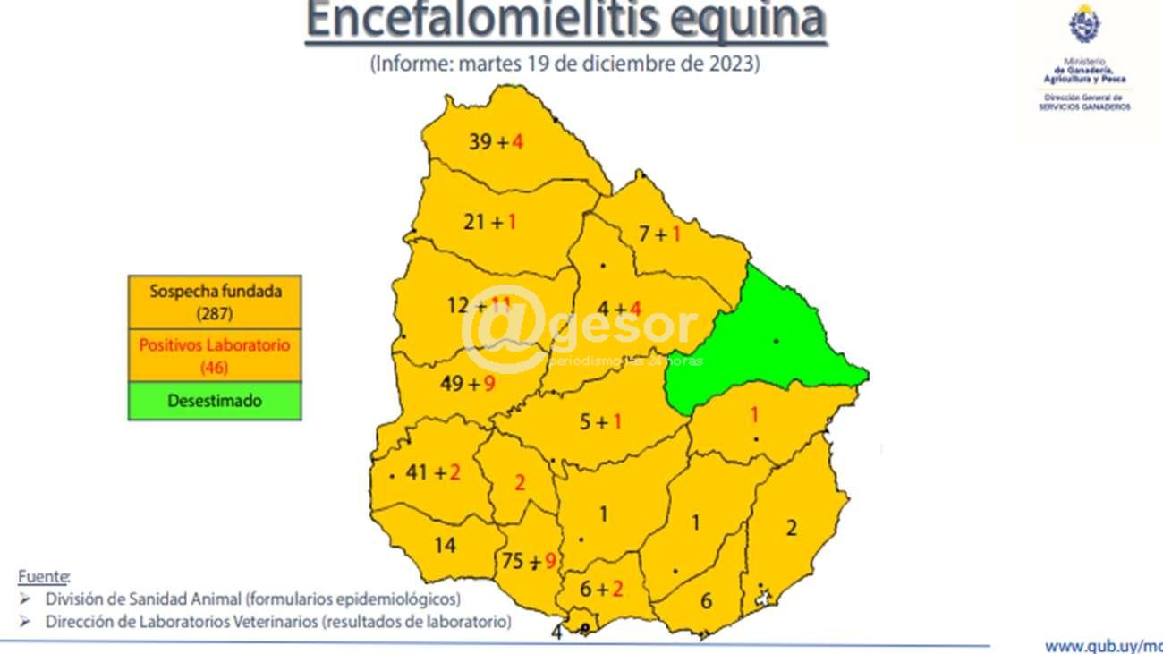 En total se han producido 102 muertes de caballos, en todo el país, producto de la Encefalomielitis de un total de 8.686 animales, lo que supone una letalidad del 31%. Hasta el Momento Cerro Largo es el único departamento en el que no se han registrados casos, ni sospechas de la enfermedad. El detalle de los casos positivos por departamentos, es el siguiente: Artigas(4), Canelones(2), Durazno (1), Flores(2), Paysandú (9), Rio Negro (9), Rivera (1), Salto (1), San José (9) Soriano (2), Tacuarembó (1) y Treinta y Tres(1).
