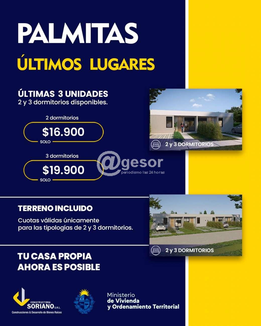 Contactanos al 097 388 063 y podrás hacer realidad tu sueño, son las últimas tres unidades que quedan en la localidad de PALMITAS, departamento de Soriano.