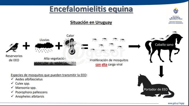 La Dirección General de Servicios Ganaderos a través de la División de Sanidad Animal (DILAVE - MGAP) recuerda que las especies de mosquitos que pueden transmitir la EEO son: aedes albifasciatus, culex spp., mansonia spp., psorophora pallescens y anopheles albitarsis.