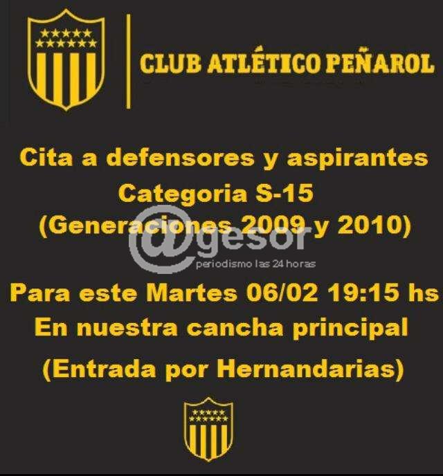 Club Peñarol de Mercedes cita a defensores y aspirantes categoría Sub 15 (generaciones 2009 y 2010).