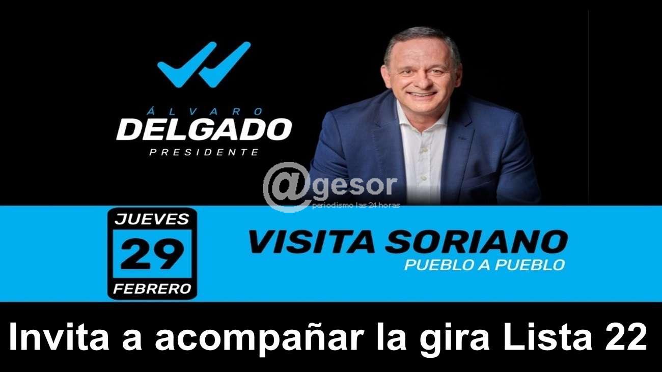 Este jueves 29 estará en varias localidades de Soriano el precandidato a la Presidencia de la República por el Partido Nacional, Alvaro Delgado, y la Lista 22 está convocando a acompañar la gira apoyado por la Lista 22 que incluye: