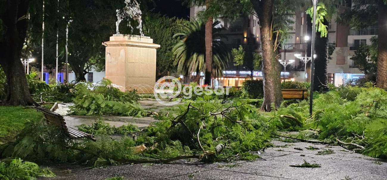 Precisamente en ese marco próximo a las 23.00 horas -la advertencia se actualizaba a las 0.15 horas de este sábado- el pronóstico se cumplió y vientos muy fuertes y lluvias intensas conformaron un combo que causó numerables daños en el alhajamiento públio y en numerosas fincas particulares, generando gran cantidad de árboles del ornato público caídos tanto en la propia planta urbana como paseos que habitualmente lo sufren como el parque Guernica.