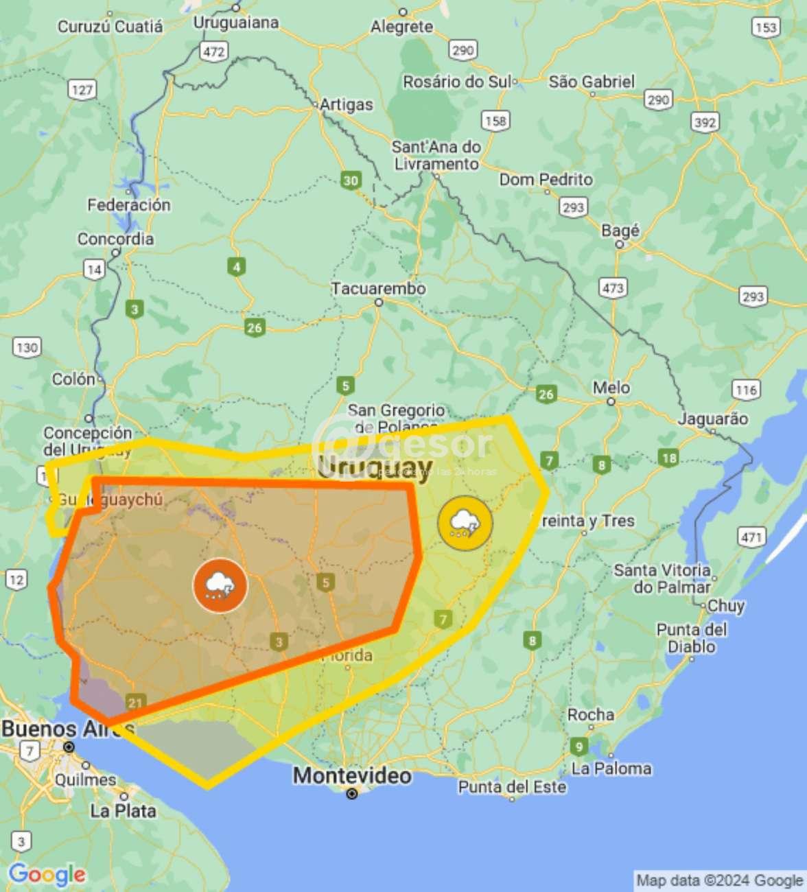 INUMET sigue manteniendo alerta naranja desde las 14.35 horas de este lunes con algunos cambios en cuanto a localidades potencialmente afectadas, extendiéndolo ahora hasta la hora 4.00 de la madrugada de este martes, incluyendo 75% de probabilidades de ocurrencia de tormentas fuertes y lluvias intensas y volvió a abarcar todo el departamento de Soriano.
