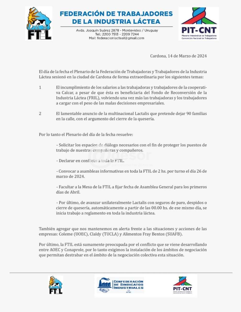 El comunicado de la Federación de  Trabajadores de la Industria Láctea  expresa: