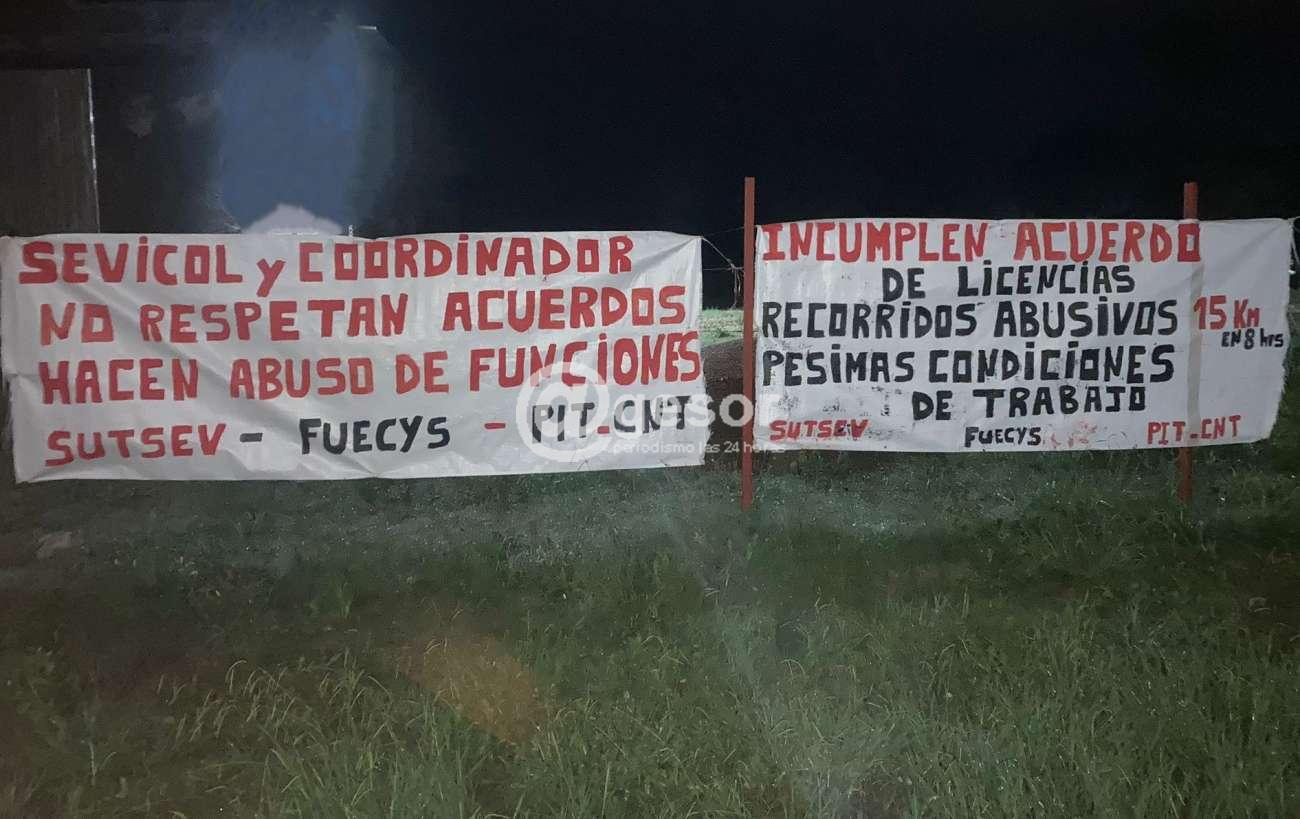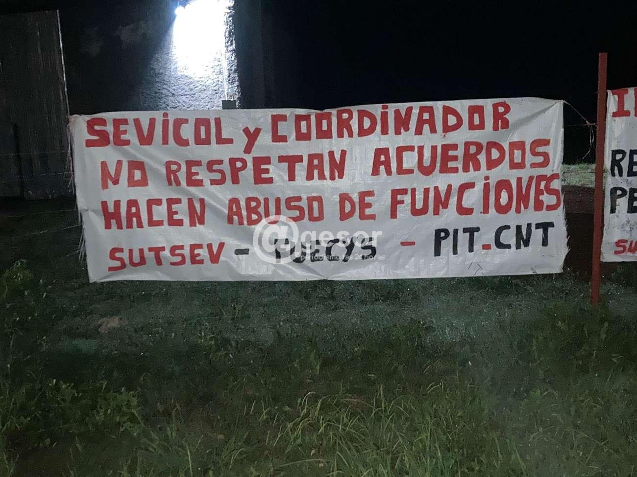 En la zona puede apreciarse desde la noche de este viernes cartelería en la que expresan las razones de esta situaciones, por ejemplo: "Sevicol y Coordinador no respetan acuerdos, hacen abuso de funciones" SUTSEV - FUECyS - PIT CNT.