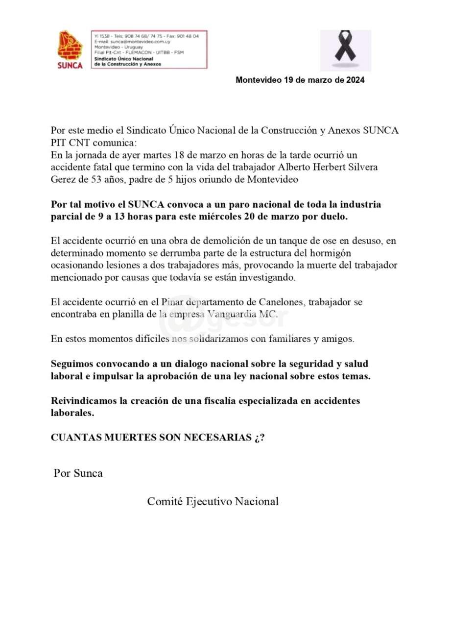 Ante el trágico accidente ocurrido en el día de ayer , en el Pinar departamento de Canelones que cobro la vida del compañero Alberto Herbert Olivera Gerez de 53 años , padre de 5 hijos.