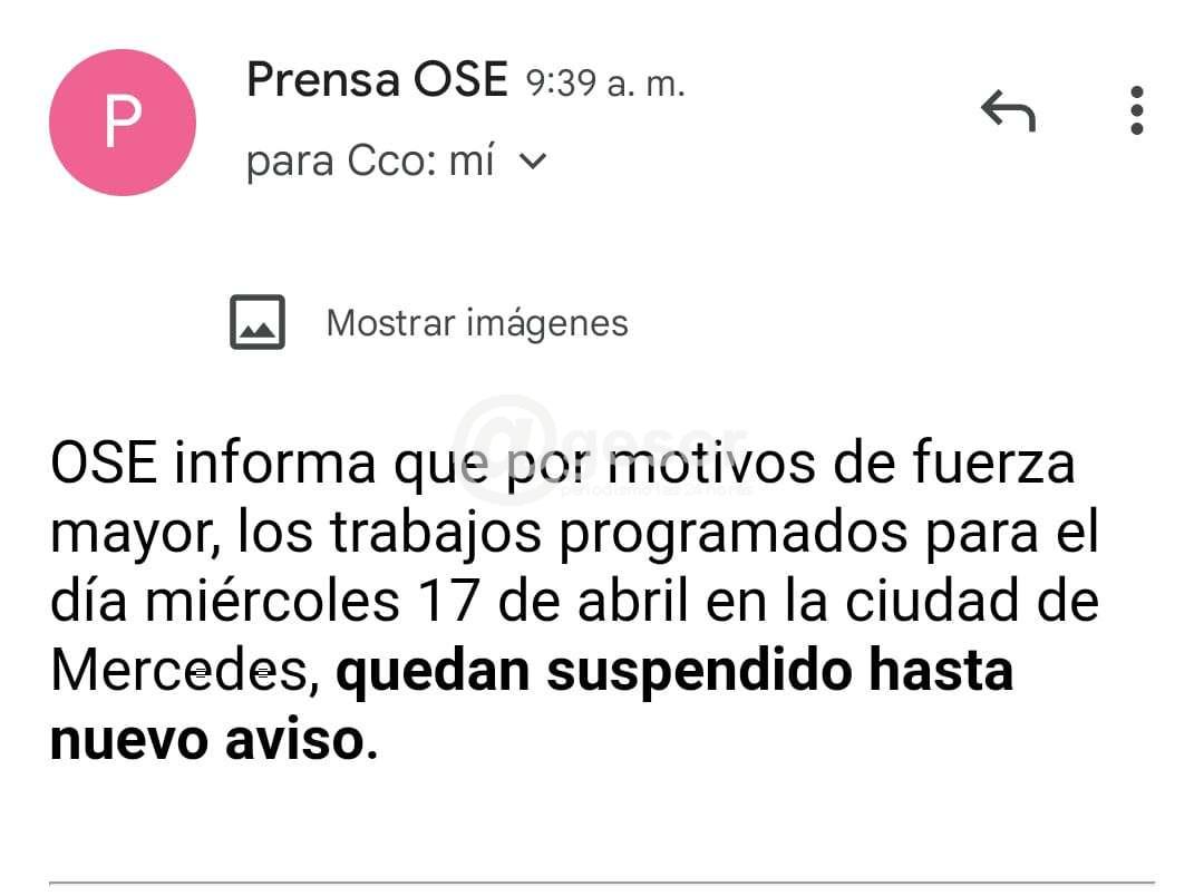 OSE postergó trabajos programados en Mercedes, por lo que el corte en el suministro de agua potable para este miércoles queda suspendido.