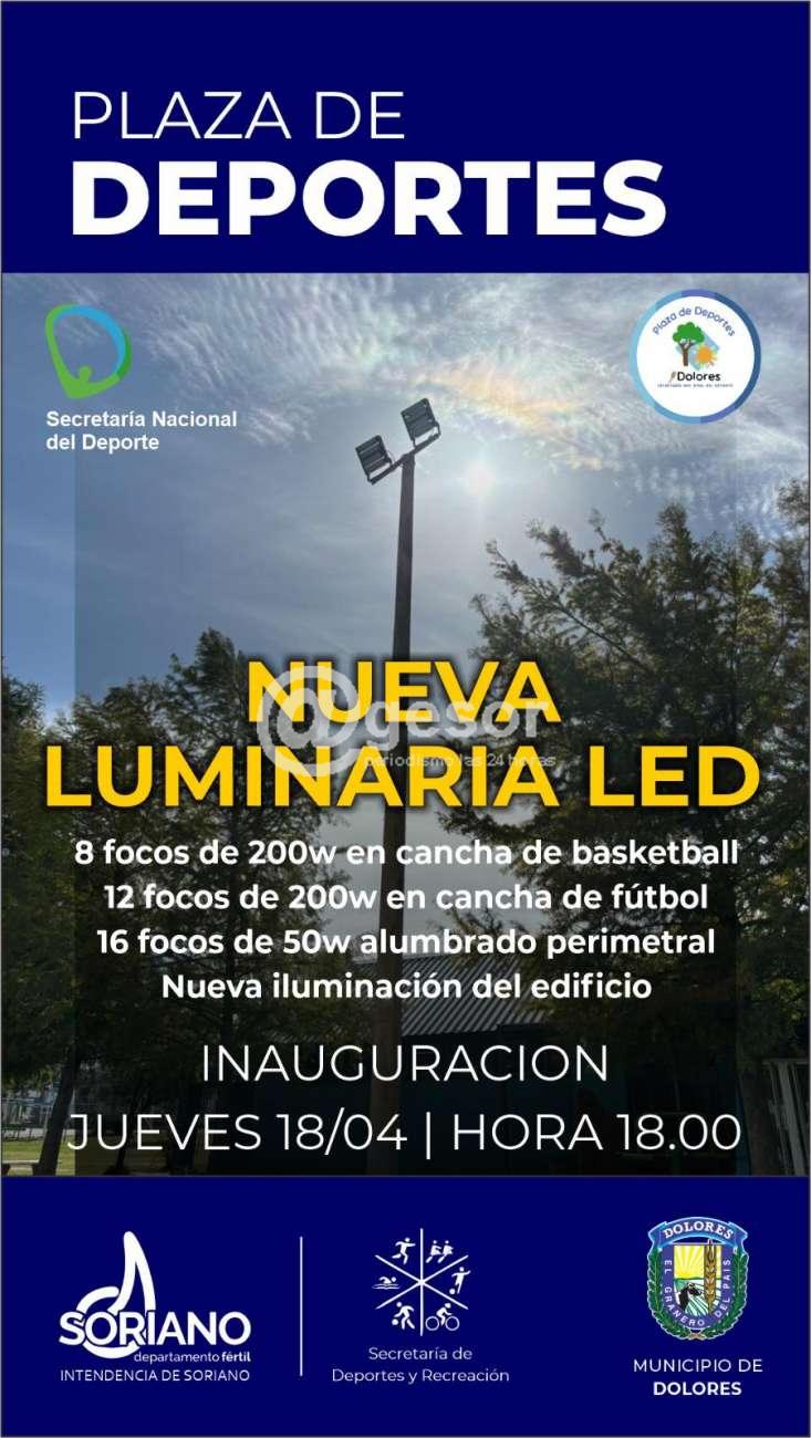 Municipio de Dolores, Intendencia de Soriano y Secretaría de Deportes y Recreación, Secretaría Nacional del Deporte, están invitando a la inauguración este jueves 18 de abril, a la hora 18.00 horas, de la nueva luminaria led de la plaza de deportes.