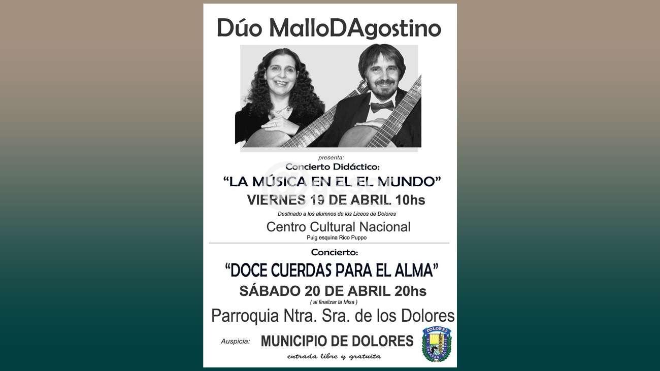 El duo de guitarras Mallo D` Agostino presentará su concierto didáctico "La música en el Mundo"., Será una actividad destinada a alumnos de los liceos de Dolores, organizada por la Parrochia Nuestra Señora de los Dolores, con el auspicio del Municipio de Dolores.