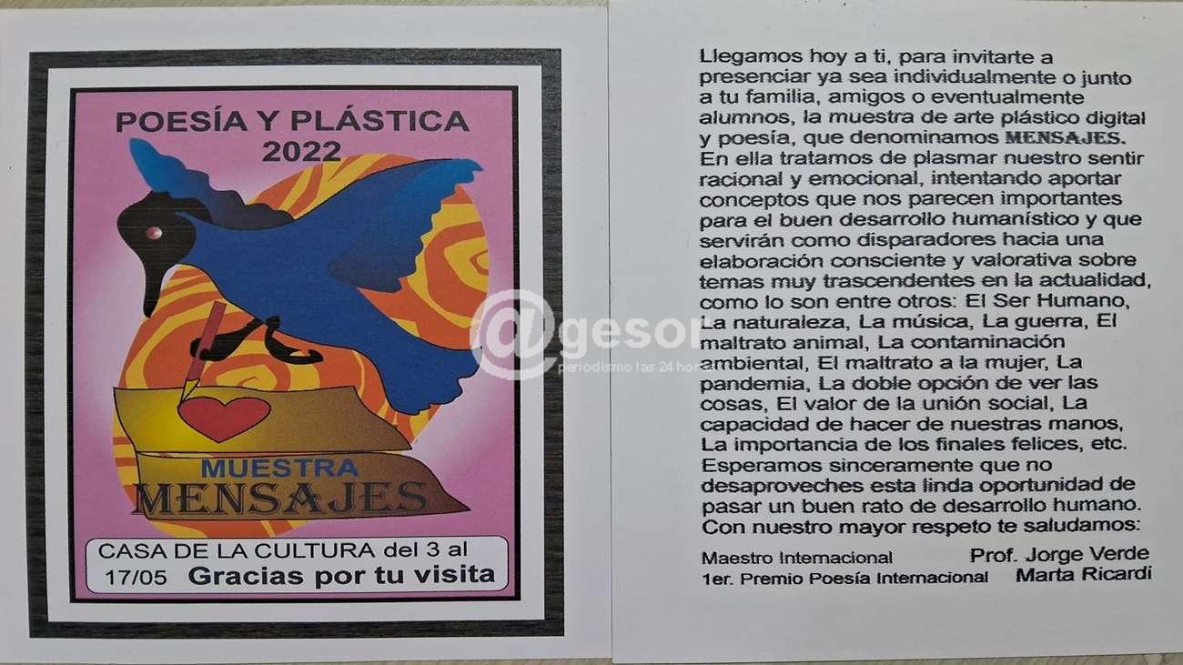 Este viernes 3 de Mayo queda habilitada la muestra "Mensajes" de Jorge Verde (plastica) y Marta Ricardi (poesía).