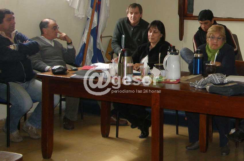 La fotografía recortada para tener un acercamiento más claro de la figura del Director del Hospital "Chelle" Dr. Daniel Thompson sentado junto al dirigente nacional de la FFSP Hebert Tejeira, a la dirigente local Andrea Lapido y Pablo Melusso también de la FFSP,los que están más cerca, es una prueba elocuente de la participación del jerarca en la asamblea.