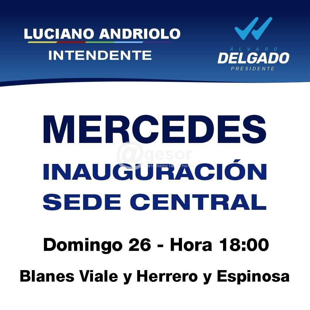 Este domingo 26 de mayo, a las 18 horas, Luciano Andriolo, candidato a intendente por el Partido Nacional, inaugura su sede central en Mercedes. La sede central de Andriolo se encuentra ubicada en calle Blanes Viale y Herrero y Espinosa.