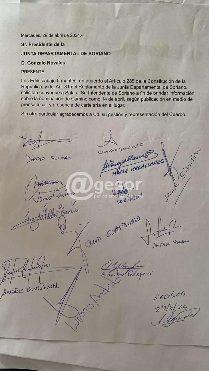 El llamado a sala se formalizó en acuerdo al art 285 de la Constitución de la República y el Art. 81 del Reglamento de La Junta Dptal. De Soriano, mediante nota al Sr. Presidente del Cuerpo firmada por 12 Ediles.