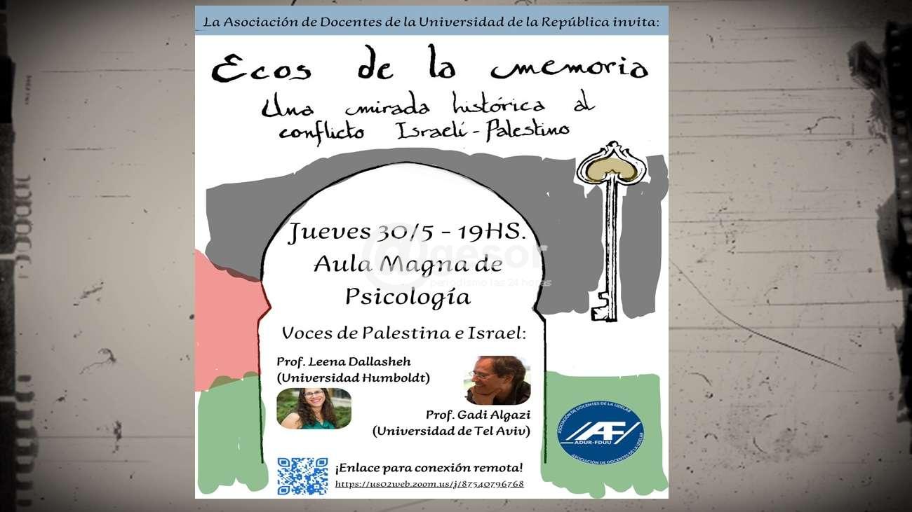 Desde ADUR queremos invitarles a la Mesa Redonda: "Ecos de la memoria. Una mirada histórica al conflicto Israelí-Palestino." que tendrá lugar el Jueves 30/5 19hs (próximo jueves) en el Aula Magna de la Facultad de Psicología.