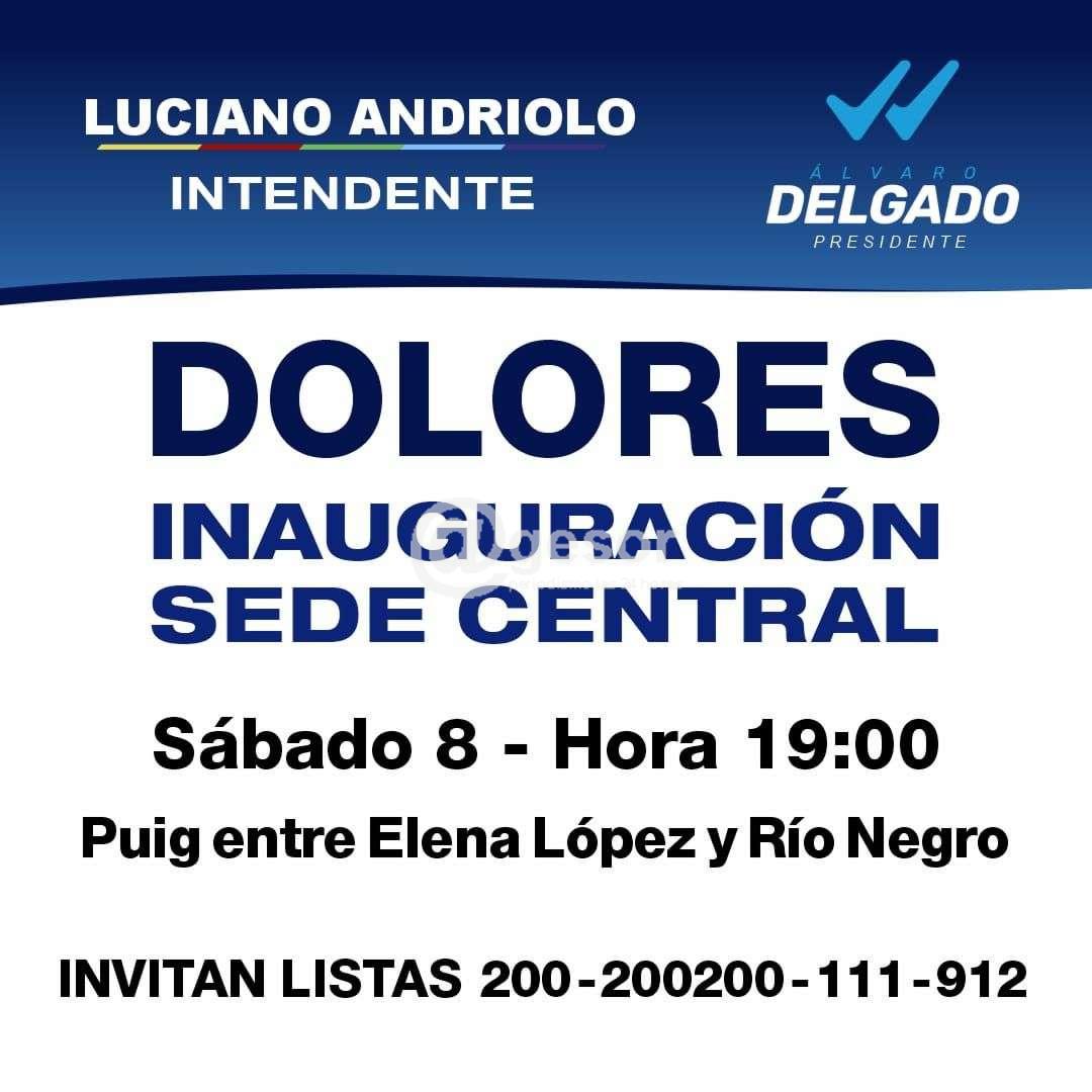 Este sábado 8 a las 19.00 horas inauguración de sede central de Dolores de Luciano Andriolo Intendente apoyando la precandidatura de Alvaro Delga a la presidencia de la República.