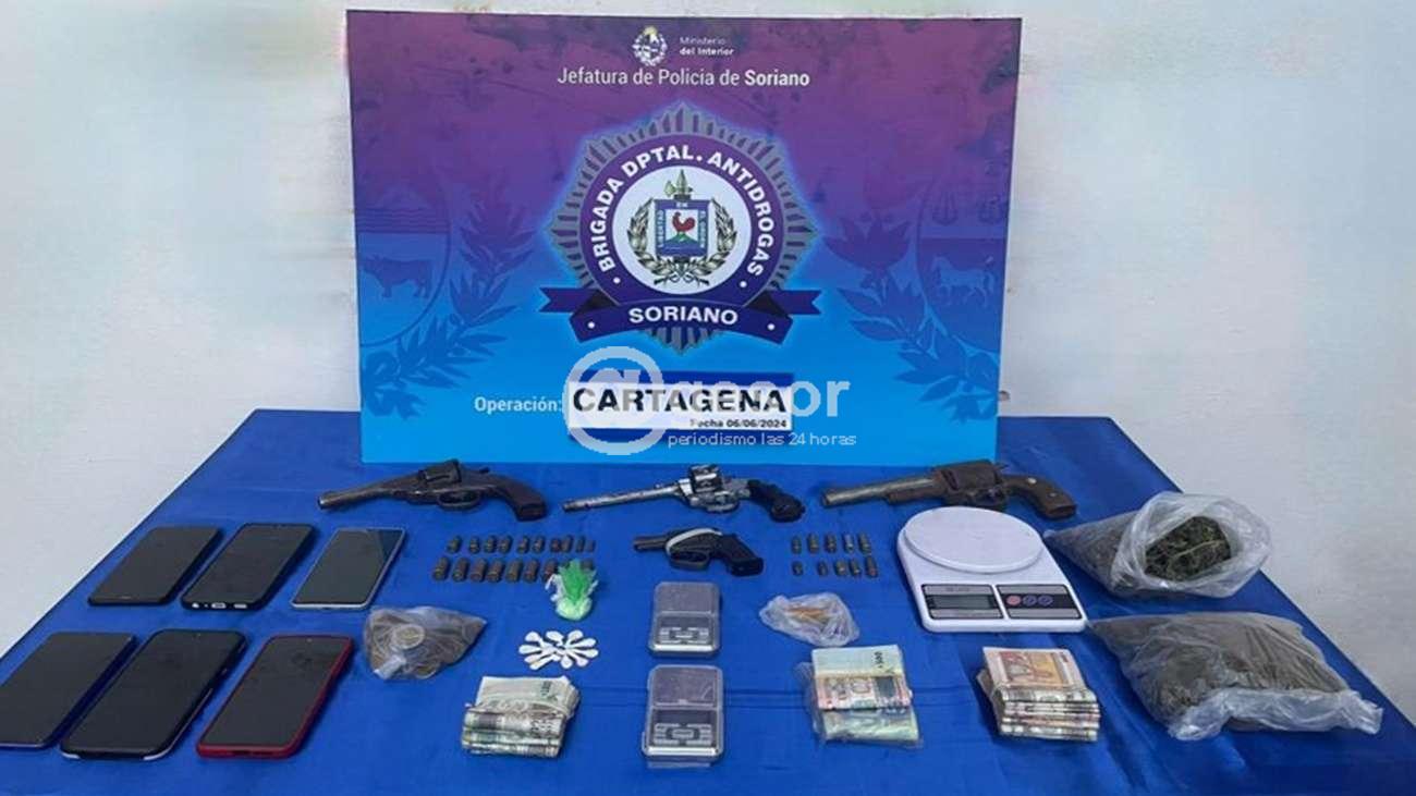 Operación Cartagena, tras cinco meses de investigación la cual implico vigilancias, seguimiento, análisis y cruzamiento de información obtenida en operaciones anteriores. Por parte del personal de la Brigada Departamental Antidrogas a cargo de la Fiscalía de Mercedes segundo turno. Por lugares de venta de sustancias estupefacientes en la ciudad de Mercedes, a raíz de la cual el día de ayer se realizaron ocho allanamientos en el barrio el "Ombú" el cual resulto con la detención de diez personas y la incautación de: